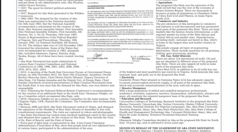 · Aba State Movement has made submissions to various State Creation Committees and National Conferences in 1988, 1996, 2001, 2005, 2006, 2009, 2010, 2014, 2021, 2024, 2025