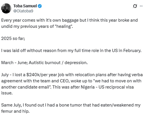 A Nigerian tech entrepreneur, Toba Samuel has listed all the trials and tribulations he passed through this year.